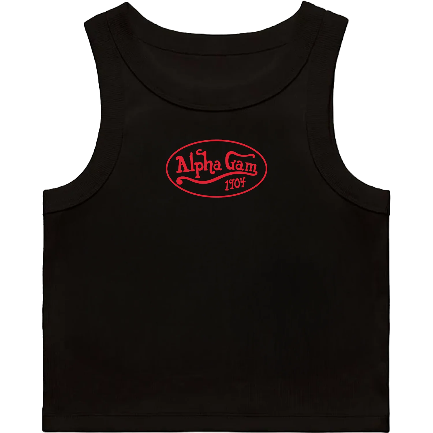 The ribbed tank features a vibrant red retro-style “Alpha Gam 1904” graphic screen-printed on the chest.